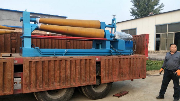 該機結構型式為三輥對稱式,上輥在兩下輥 對稱位置作垂直升降運動,通過絲桿絲母蝸桿傳動而獲得,兩下輥作旋轉運動,通過減速機的輸出齒輪與下輥齒輪嚙合,為卷制板材提供扭矩。上輥可分離取料電動升降起輥。可安裝靠輪卷制錐體、角鐵、槽鋼等異異型鋼材。